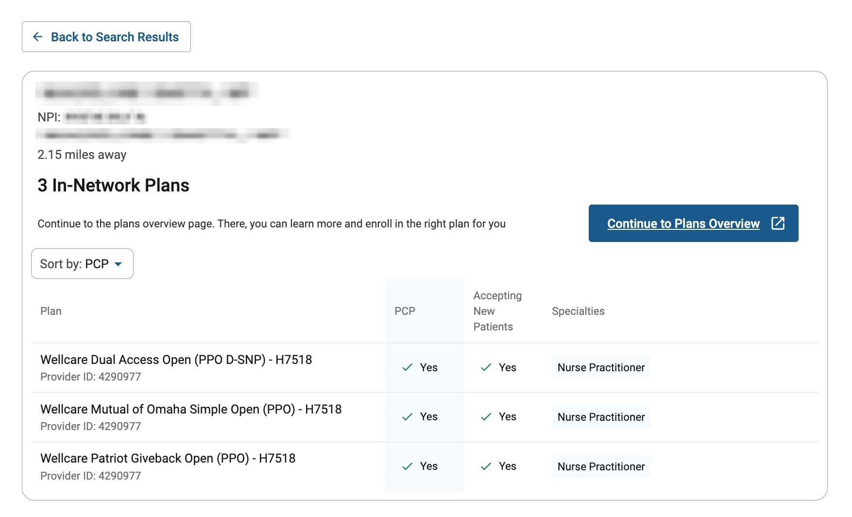 - A list of the plans the provider accepts will appear, along with whether they are a PCP, are accepting new patients, and their specialties.