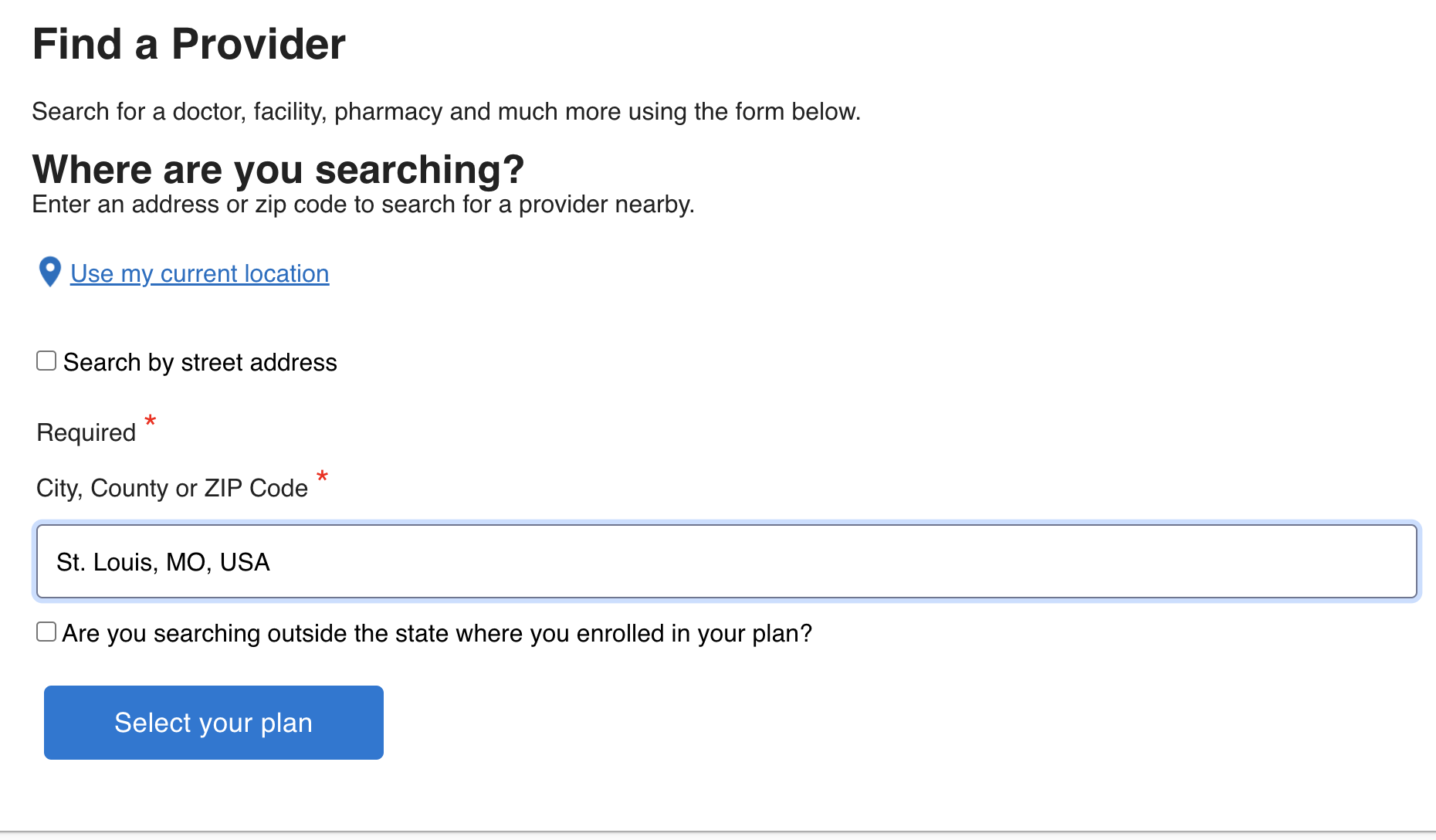 - Enter the city, county, or zip code where you are looking for a provider. Click Select Your Plan.